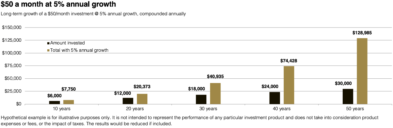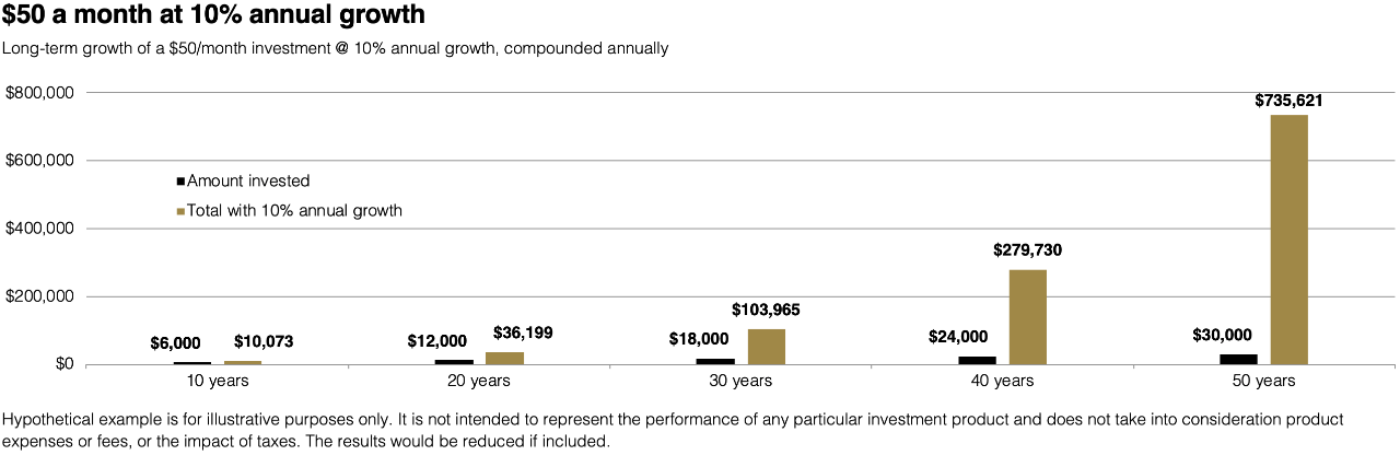 In this example with a 10% return, you’ll see that the same $50-per-month investment quickly grows to an even more meaningful amount over time if it is earning a higher percentage of annual growth, and 10% may not be an unreasonable expectation based on the average history of the S&P 500® Index. Keep in mind that achieving this average rate of return will, however, depend on the performance of the funds you select for your investment and being invested for the long term.