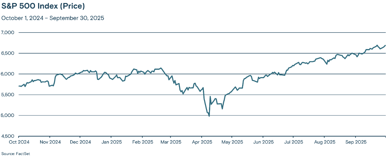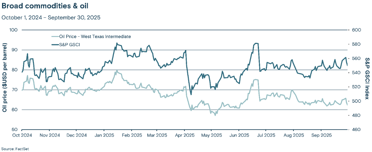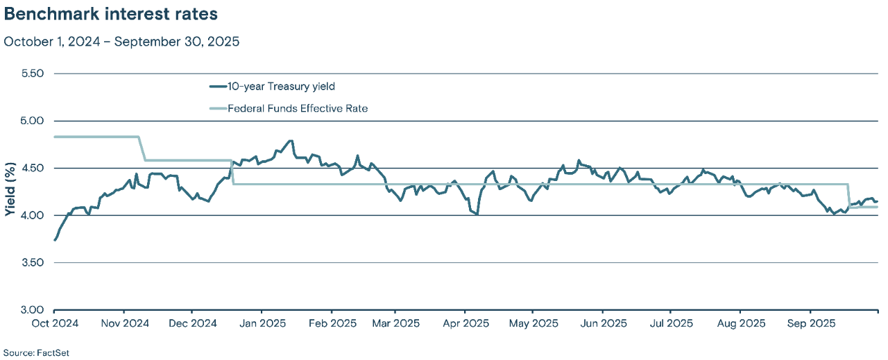 Bonds: The Bloomberg U.S. Aggregate Bond Index rose 2.03% over the quarter. Benchmark 10-year Treasury yields fell modestly, and investment-grade corporate bonds spreads remained tight. Shorter-dated 2-year Treasury yields pushed lower over the period as expectations grew that the Fed would soon return to easing monetary policy. At its September meeting, amid indications the economy had softened and inflation increases were moderating, the Fed cut its policy rate by 0.25% while signaling two more cuts were likely to take place in the remainder of 2025.
