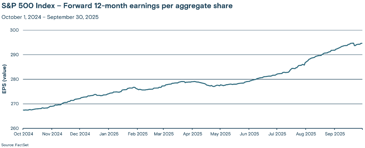 Corporate 12-month earnings projections for the S&P 500 Index extended their steady climb higher, rising 4.49% over the quarter, supported by strong second-quarter earnings and positive revisions to expected earnings.