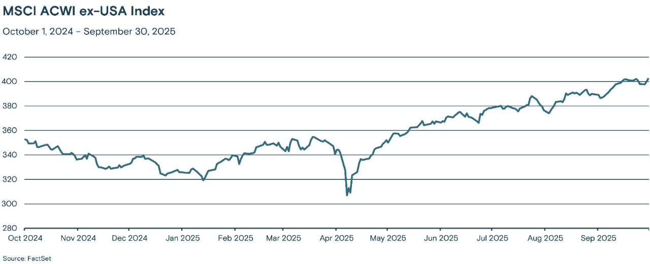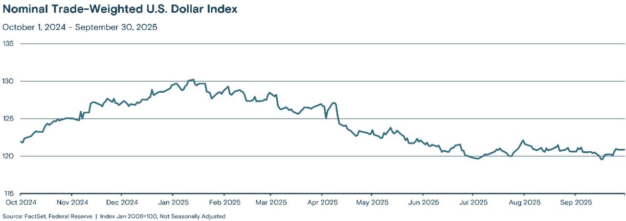The Nominal Trade-Weighted U.S. Dollar Index rose 0.86% in the third quarter, largely due to a reduction in tariff-related uncertainty and a broad-based improvement in investment sentiment, which lessened concerns over a large rotation away from the dollar by foreign investors. Also, the U.S. dollar benefited by a decline in market expectations for Fed interest rate cuts, as higher U.S. rates help support the dollar. While the Fed did cut interest rates during the quarter, the reduction was largely in line with expectations. Year-to-date through the third quarter, the trade-weighted U.S. dollar fell about 7%.