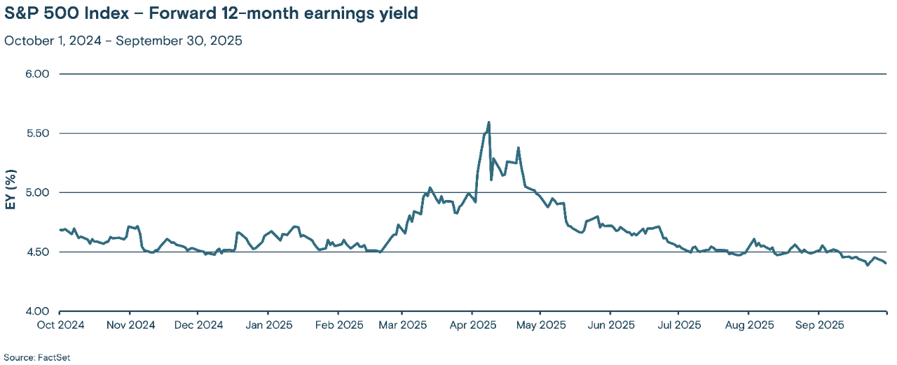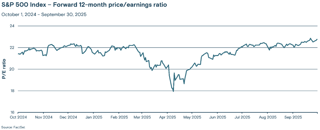 The forward 12-month price-earnings ratio (P/E) of the S&P 500 Index rose 3.05% over the quarter, from 22.09 at the end of June to 22.77 at the end of September. A higher P/E ratio means stock valuations are higher relative to their earnings per aggregate share.