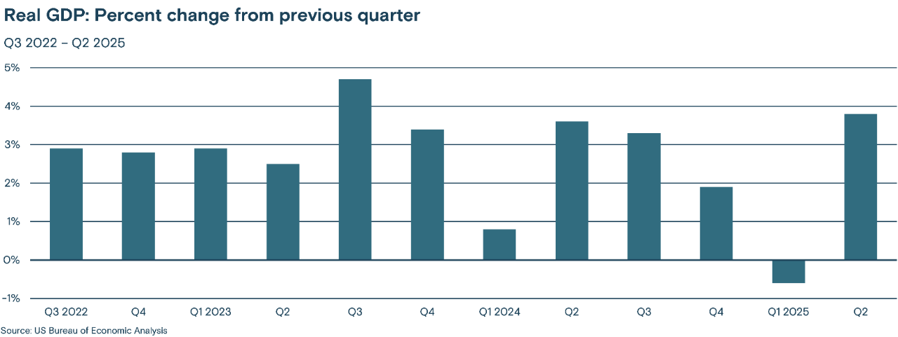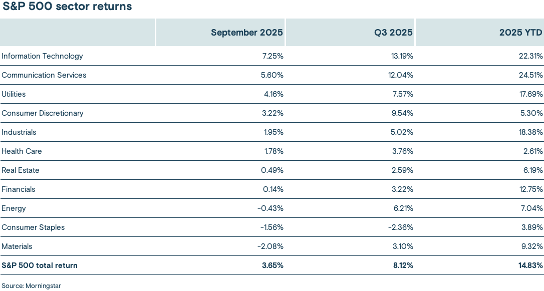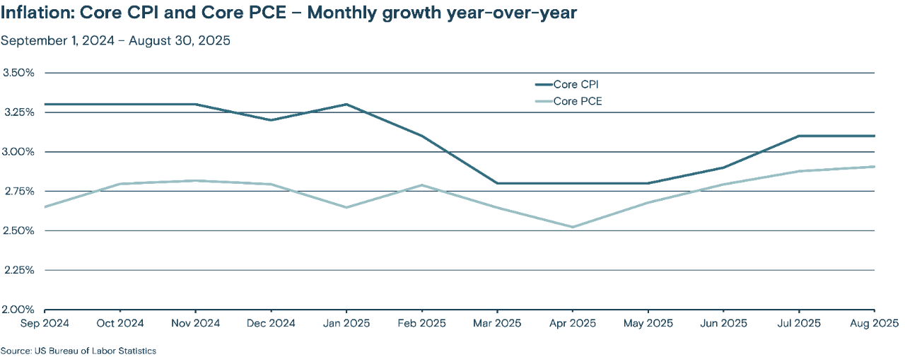 Inflation rose over the period, but the impact of tariffs on prices was generally more modest than expected. The headline Consumer Price Index (CPI) rose 0.4% in August, the biggest monthly gain since January, putting the annual inflation rate at 2.9%. The Core Personal Consumption Expenditures (PCE) Price Index, the Fed’s preferred inflation measure, rose 2.9% in August, below consensus expectations for a 3.0% rise. Nevertheless, the figures remain above the Fed’s target rate, which is a long-term average of near 2%—a level not seen since early 2021.